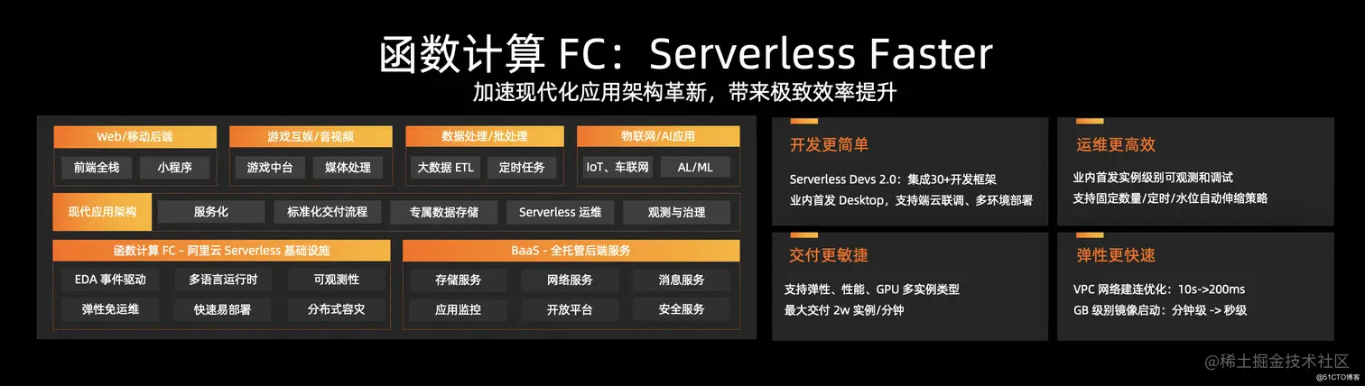 今天,函数计算 FC 也提出了新的理念:Serverless Faster,以更快的计算,加速现代应用架构革新。首先,函数计算支持了很多场景,包括 Web/移动后端、游戏互娱/音视频、数据处理/批处理等。我们希望函数计算的开发更简单、更快速,包括 Serverless Devs2.0集成30+开发框架,支持端云联调、多环境部署,运维更高效。同时,函数计算 FC 业内首发实例级别可观测、可调试,让交付更敏捷,最大可以交付 2万实例/分钟。我们也让弹性更快速,可以看到 VPC 网络建连优化,从 10 秒降低到 200 毫秒,GB级别镜像启动从分钟级降低到毫秒级,弹性能力大幅提升。