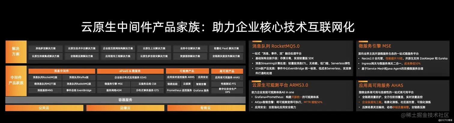 云原生中间件完全兼容开源开放标准,支持超大规模复杂场景,具备企业级特性,可以实现高可靠的 SLA。在云原生中间件产品之上,我们也为企业提供了全面的解决方案,如异地多活、全链路压测、企业高可用、资源混部等。对于想要做云原生升级的企业而言,阿里云提供了完善的解决方案,从微服务治理到迁云、架构升级、业务中台等,帮助企业向现代化架构演进。