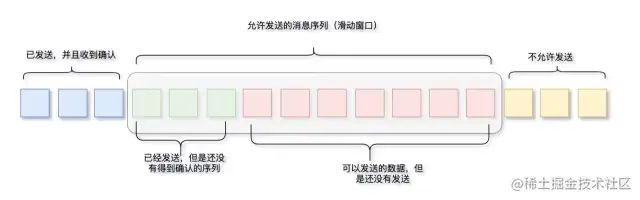下面是发送端滑动窗口的示意图,滑动窗口的大小是绿色部分和红色部分的序列长度。它工作的机制是这样的,一旦发送端收到一个确认,滑动窗口就会向右移动。