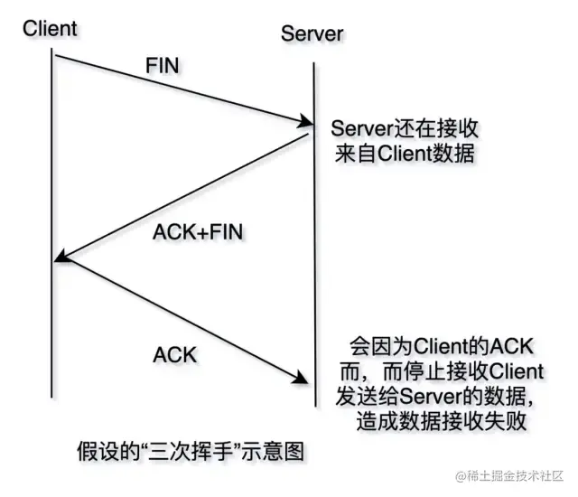 也可以这样考虑,上面提到的问题。假如在第二次挥手的时候,Server在给Client发送ACK的同时,也发送了FIN的请求。那么如果,Server还在接收从Client传输过来的数据,则会因为Client的下一个ACK而关闭接收数据的通道,数据就会接收失败就像下面的这个图那样。