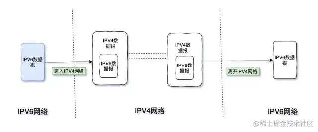 - 「隧道技术」:何谓隧道技术了?其实完全可以通过字面的意思理解。下面还是以画图的方式帮助大家理解。隧道技术说白了就是数据在传输的时候进行了另一种的封装与解封,如图数据由IPV6网络进入到IPV4的网络,需要把IPV6的数据包封装在IPV4的数据包里。