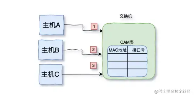 有三台主机A,B,C和交换机连接在一起,最开始,CAM里没有存储任何信息。