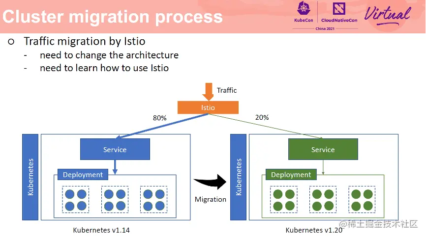 另外一种流量迁移方式是基于 Istio 实现的。Istio 方式比较复杂,学习成本比较高。需要新建一个 Istio 集群,并且更改已有的应用部署方式,然后基于 Istio 的灰度能力进行流量迁移。