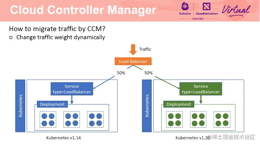 了解 LoadBalancer service 工作原理后,能不能通过 CCM 实现实时无损流量迁移呢?答案是可以的。将两个集群的节点加入到同一个 SLB 的同一个端口中,然后通过修改两个集群所占权重即可实现流量迁移。对于客户端来讲,访问的仍然是以前的 SLB ip 和 port,完全无感。