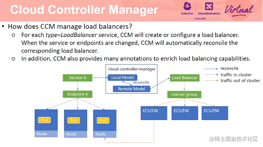 对于 LoadBalancer 类型的 Service,CCM 会为该 Service 创建或配置阿里云负载均衡 SLB。CCM 首先会查询 Kubernetes Service 信息,构建 Local model,然后查询 SLB 信息,构建 Remote model。对比两个 model 的差别,根据 Local model 更新 Remote model,直到两个 model 一致。当 Service 对应的 Endpoint 或者集群节点发生变化时,CCM 会自动更新 SLB 的虚拟服务器组中的后端。此外,CCM 还提供了许多阿里云特定注解,支持丰富的负载均衡能力。