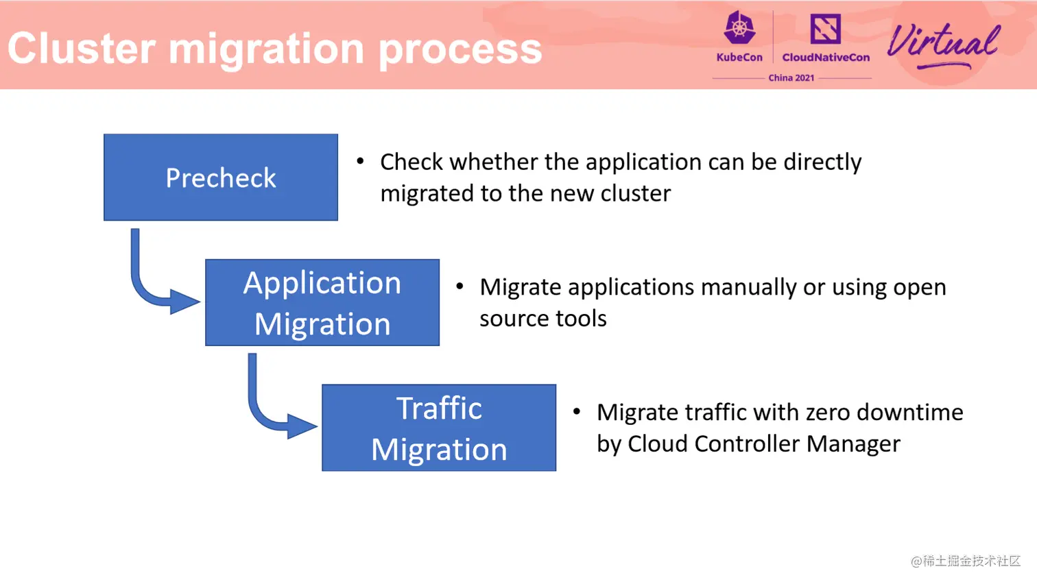 第一阶段:前置检查,提前暴露迁移可能存在的潜在风险;第二阶段是应用迁移,这一阶段需要新建一个目标版本的集群,并将应用及其数据迁移到新的集群中;第三阶段是流量迁移,这一阶段至关重要,他决定了如何不停机地将线上流量导入到新建的集群中,并使用新建的集群为用户提供服务。