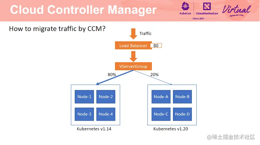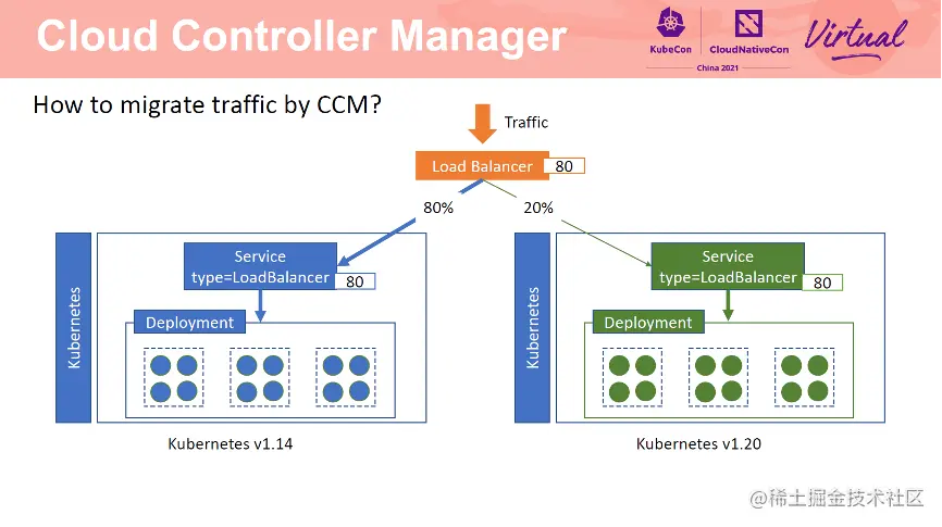 配置完成后,流量转发方式如上图所示。有 80% 的流量转发到 1.14 集群中,20% 的流量转发到 1.20 集群中。