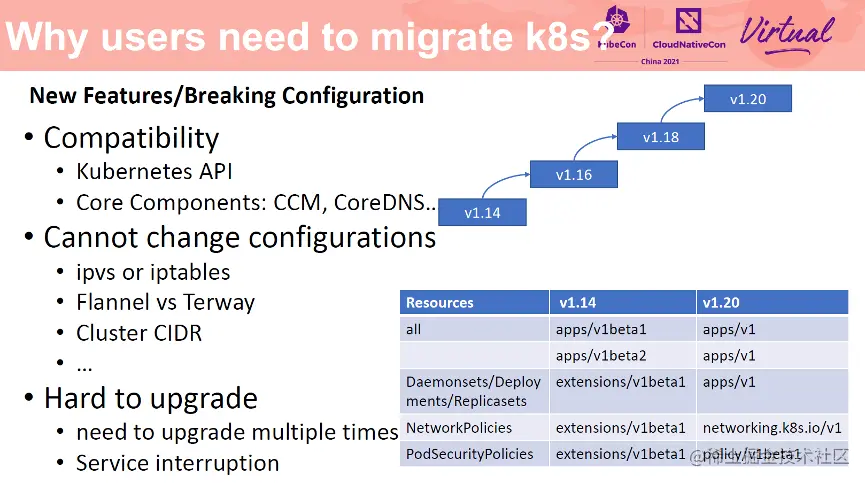 除了升级困难以及版本兼容性问题,升级已有集群无法实现一些配置变更类的需求。比如你无法直接变更一个已有集群的网络模式,比如从 IPTables 切换到 IPVS,Flannel 到 Terway,更改 Cluster CIDR 等。这些变更会造成整个集群已有节点及 Pod 的重建,造成服务不可用,甚至是整个集群配置被污染。因此不停止迁移 Kubernetes 集群应用在这种情况下可能是一个更好的选择。