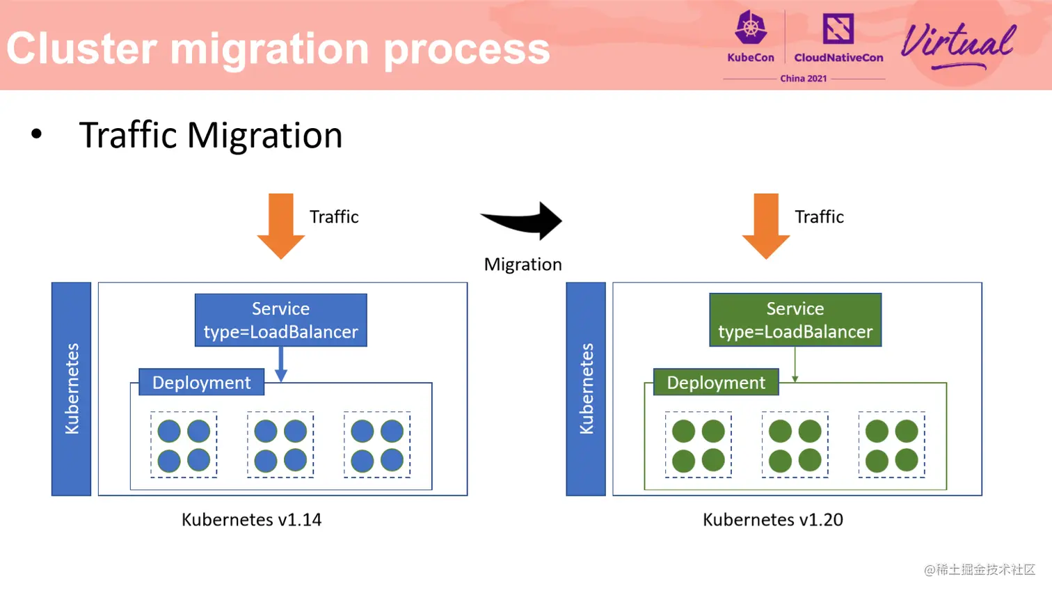 接下来介绍一下流量迁移部分。流量迁移是集群迁移中十分重要的环节。流量迁移是指在业务流量无中断的前提下,将业务流量从一个集群迁移到另一个集群中去。客户端对流量迁移应当完全无感。