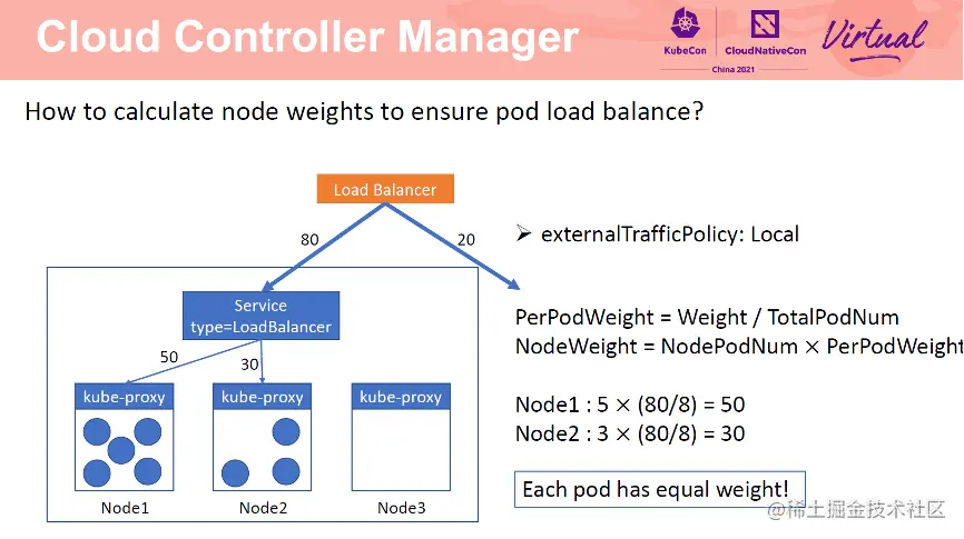 对于 externalTrafficPolicy 为 Local 的 service,CCM 仅会将 Pod 所在节点加入到 SLB 后端。因为如果节点没有 Pod,当请求转发至该节点时,请求会被直接丢弃。Local 模式下,需要先计算每个 Pod 的权重,即 PerPodWeight=Weight/TotalPodNum。节点权重为 NodePodNum*PerPodWeight。Node1 为 50,Node2 为 30。由于每个 Pod 的权重都为 10,因此 Pod 间可以实现负载均衡。