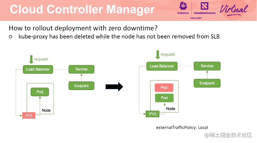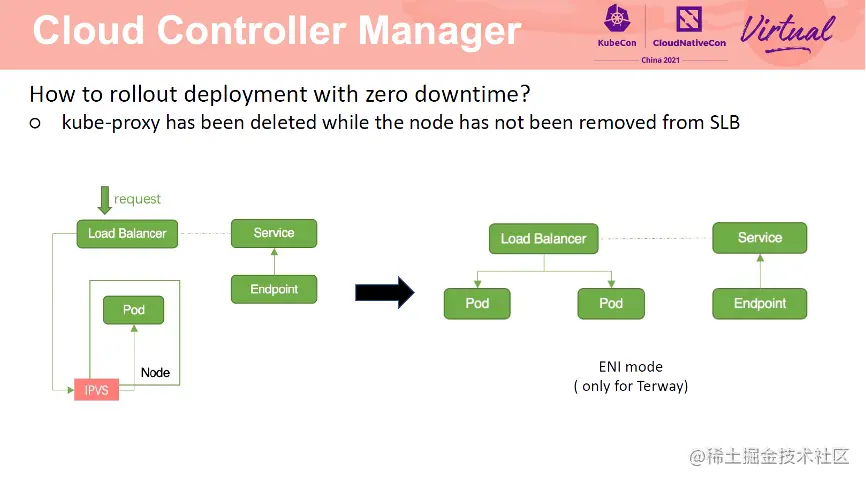 由于 CCM 与 kube-proxy 是异步进行的,因此会出现 SLB 还未移除 Pod,kubeproxy 已经将节点转发规则清理的情况。此时,请求进入 SLB 后,转发至 Node上,由于 kube-proxy 已经将路由规则清理了,所以该请求无法处理。将 service 改为 cluster 模式可以解决这一问题。如果 Service 一定需要为 local 模式,那么需要保证一个节点上有多个 Pod。也可以通过设置 Service 为 eni 模式解决这一问题。