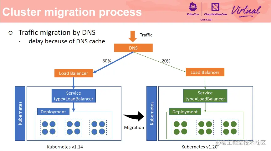 DNS 是实现无损流量迁移的一种方式。分别在两个集群中创建两个 LoadBalancer 类型 Service,然后将两个 SLB 添加到 DNS 后端,基于 DNS 的灰度能力实现流量分发到两个不同的集群中。这种方式较为简单,但是有一个比较大的缺陷,DNS 缓存有过期时间,流量切换后需要等待 30 分钟左右才能生效。当在新集群中进行业务回滚时,这个延迟不可接受的。