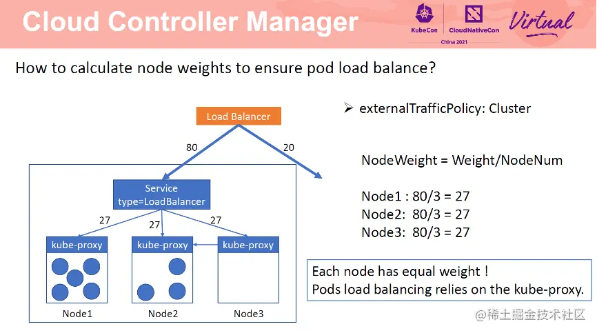 对于 externalTrafficPolicy 为 Cluster 的 service,CCM 会将所有节点加入到 SLB 后端。每个节点的权重为 weight/NodeNum。此时,Node1,Node2,Node3 权重均为 27,但是三个节点上的 Pod 数量并不均衡,那么如何实现 Pod 负载均衡呢?Cluster 模式是依赖 kube-proxy 实现的。在 cluster 模式下,kube-proxy 会将所有 Pod 信息写入到本地的转发规则中,并以轮训的方式向这些 Pod 转发请求。以 Node3 为例,该节点上没有 Pod,当请求发送到 Node3 节点后,kube-proxy 会将请求转发给 Node1 或者 Node2。