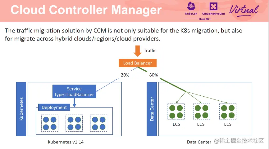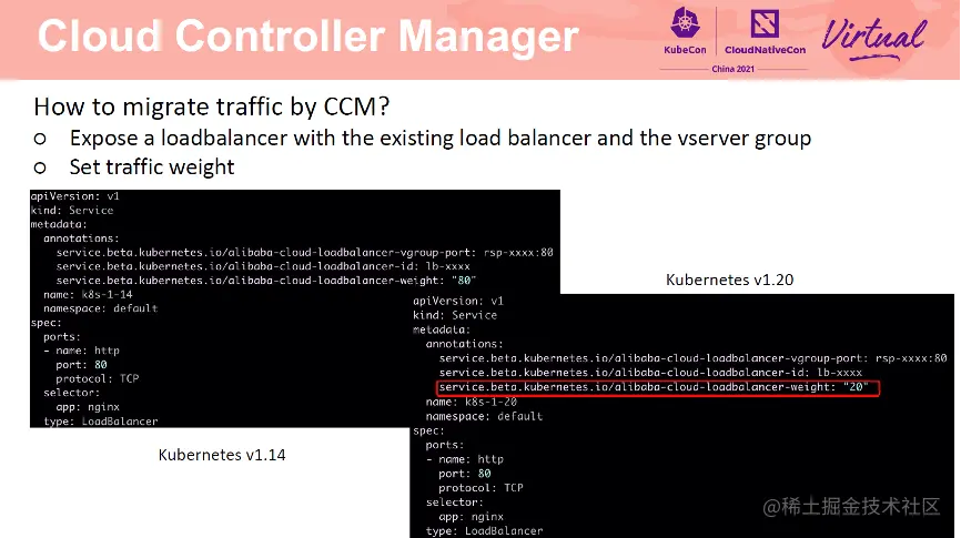 具体操作如下:首先在 1.14 集群中创建一个 Service,指定已有 SLB 及端口,以及端口关联的虚拟服务器组。然后在 1.20 集群中创建一个 Service,指定同样的 SLB、端口及虚拟服务器组。通过 weight annotation 为两个集群设置权重。