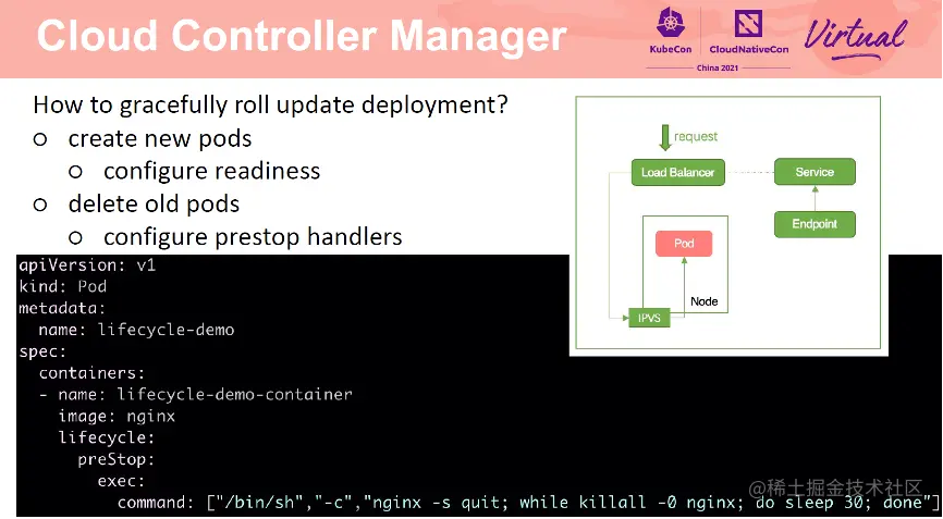应用更新分为两个步骤,创建新的 Pod,等待 Pod running 后,删除旧的 Pod。新的 Pod 创建成功后,CCM 会将其挂在到 SLB 后端,如果新建的 Pod 无法提供服务,那么请求就会失败。因此,需要为 Pod 添加就绪检测。仅当 Pod 可以对外服务时,才将其加入到 SLB 后端。在删除 Pod 时也会遇到同样的场景。因为 Pod 删除和从 SLB 后端移除 Pod 是异步进行的,如果 Pod 以及删除,但是还未从 SLB 后端移除,就会出现请求转发到后端,但是无 Pod 处理导致请求失败的情况。因此需要为 Pod 添加 prestop hook。