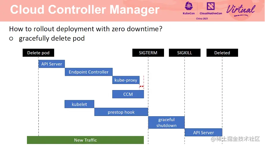 Pod 优雅退出过程如上图所示。首先 kubelet delete pod,然后 endpoint controller 更新 endpoint。更新完毕后,kube-proxy 移除节点转发规则。CCM 检测到 endpoint 更新事件后,从 SLB 后端移除 Pod。在apiserver 删除 Pod 时,kubelet 同时开始删除 Pod 逻辑,触发 Pod prestop。在 prestop 结束后发送 sigterm 信息。在整个 Pod 优雅退出过程中,直到 CCM 从 SLB 后端移除 Pod 之前一直会有新的流量进入。