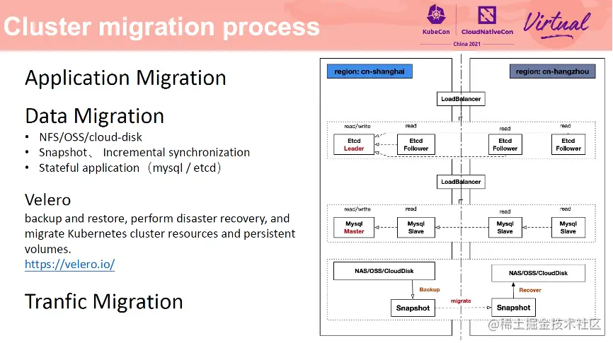 通常云上的存储主要有 NFS、OSS 对象存储、CloudDisk 云盘等,通常各大云厂商都为磁盘类型的存储提供了完善的快照方法及恢复方法。上图展示了如何将上海 Region 的应用数据迁移到杭州 Region 的方法,对于磁盘存储类型,首先在上海 Region 构建磁盘快照,然后将快照通过云厂商的网络同步到待恢复的地域杭州,然后通过快照恢复功能创建一块磁盘,然后挂在到节点上后应用即可随时使用。