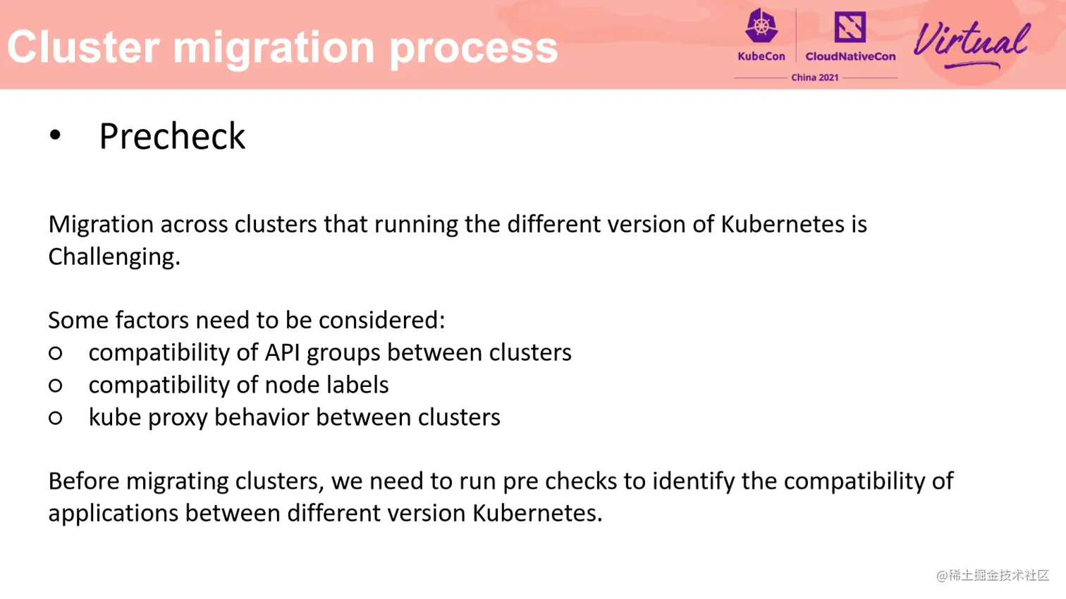 首先在前置检查阶段,我们需要尽早的暴露迁移风险,因此我们开发了一套前置检查框架,用来检查集群是否做好了迁移准备。比如不同版本的集群会有 API groups 兼容性,需要提前处理 Label 的兼容性,不同版本的组件的行为差异等,如 kubeproxy 处理 SLB 流量转发的行为差异,会直接影响流量迁移的成功。因此前置检查是一项非常重要的步骤。