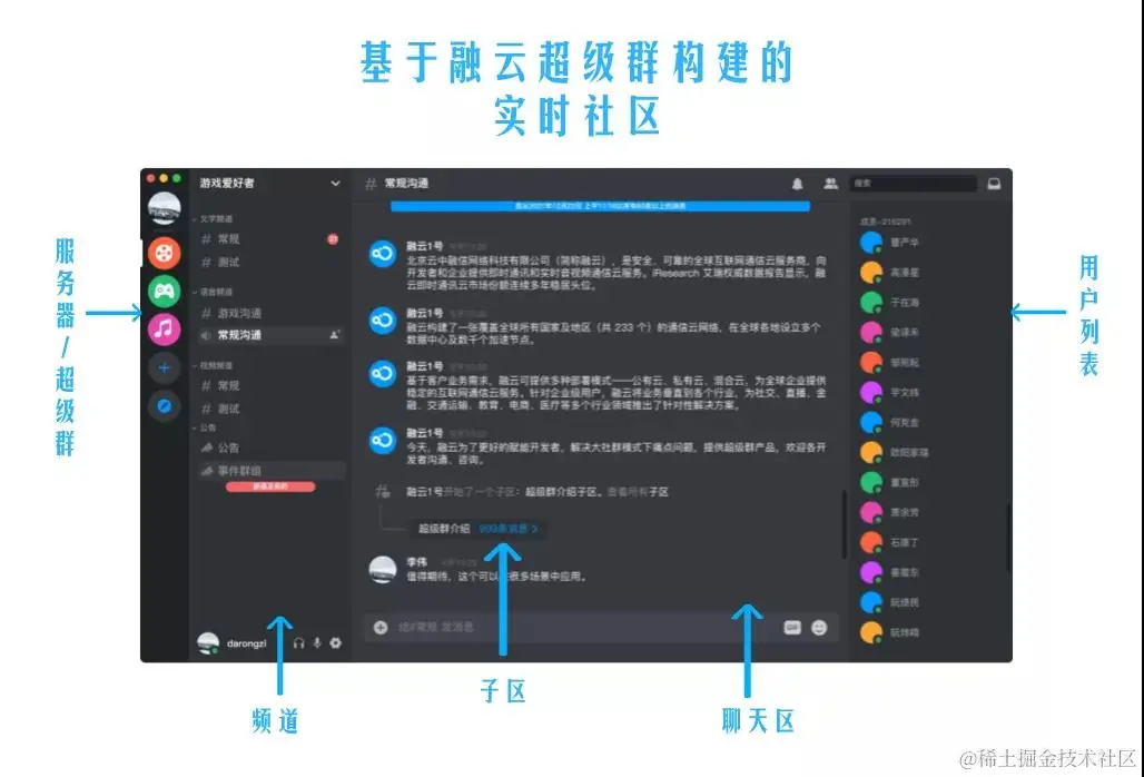 而在基于融云超级群构建的实时社区中,用户可以加入不同游戏的服务器,甚至跳出游戏,加入其他兴趣类别的服务器,让这个基础无限扩大,从而获得持续的用户互动。