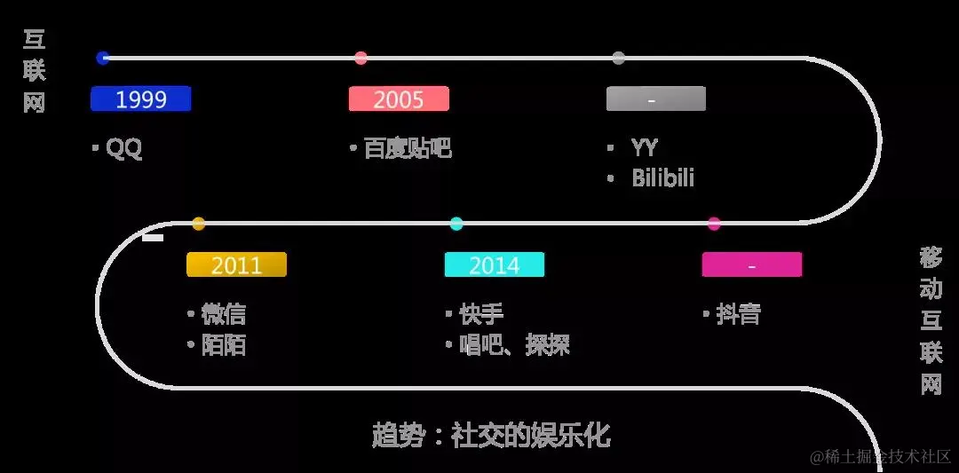 社交产品大概分为社区型、工具型、娱乐型三类,在不同的发展阶段都有极具代表性的爆款产品。比如内容社区类型的天涯、贴吧、微博、快手、抖音,工具类的 QQ、微信,泛娱乐社交的玩吧、陌陌、Soul 等。