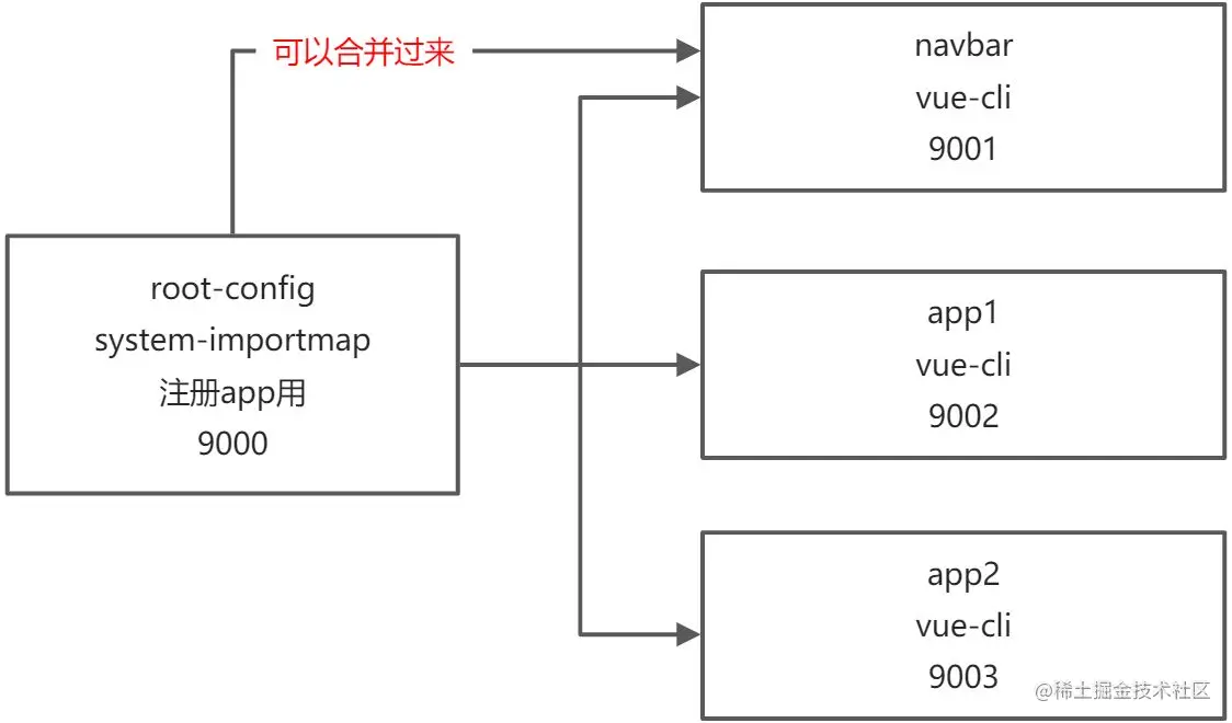 - root-config目前只是一个入口项目,包含html、SystemJS的基础配置,没有实质性的内容;navbar是导航窗口。可以考虑改造: