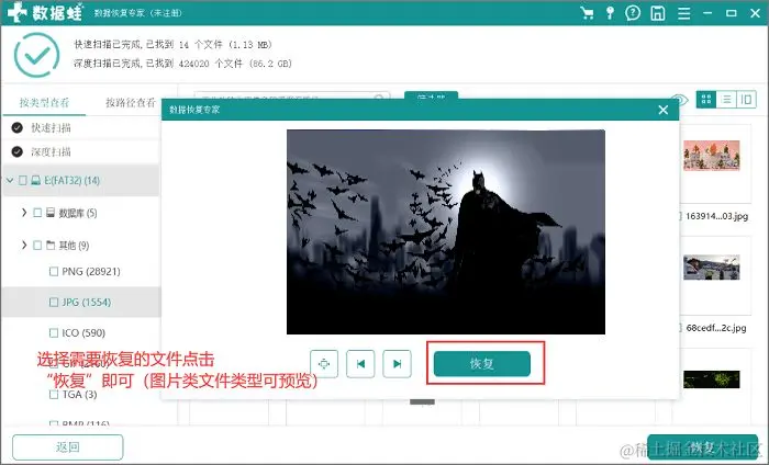 第3步:找到你丢失或者删除的那个文件,我们可以直接勾选文件名前面的小方格,也可以先双击文件预览一下再恢复,图片文件大部分是可以清晰预览的,然后确定你想要恢复的文件,点击“恢复“,还可以自主决定该文件恢复的路径哦!