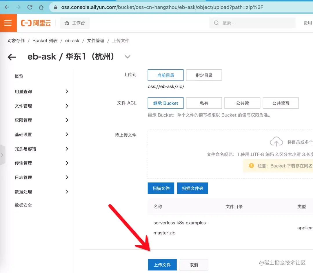 服务已经准备好了,现在找一个 zip 文件上传到 OSS 就能看到效果了。上传一个 zip 文件到 zip 目录以后应该能在 unzip 目录中看到解压后的文件。