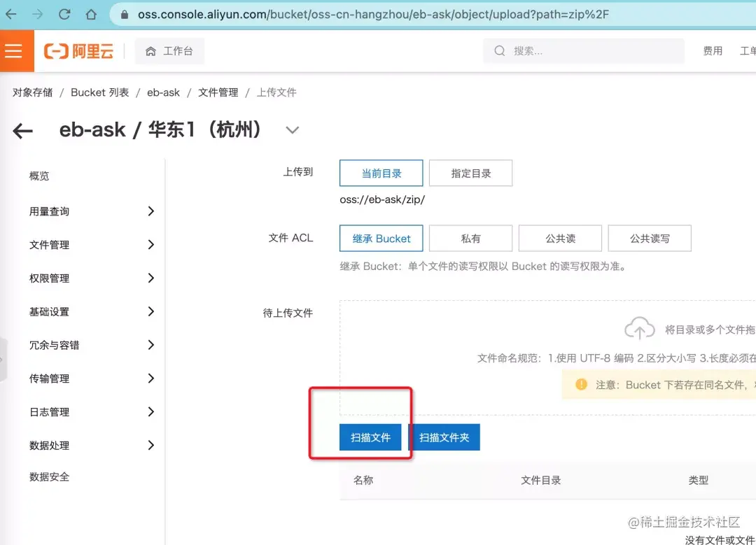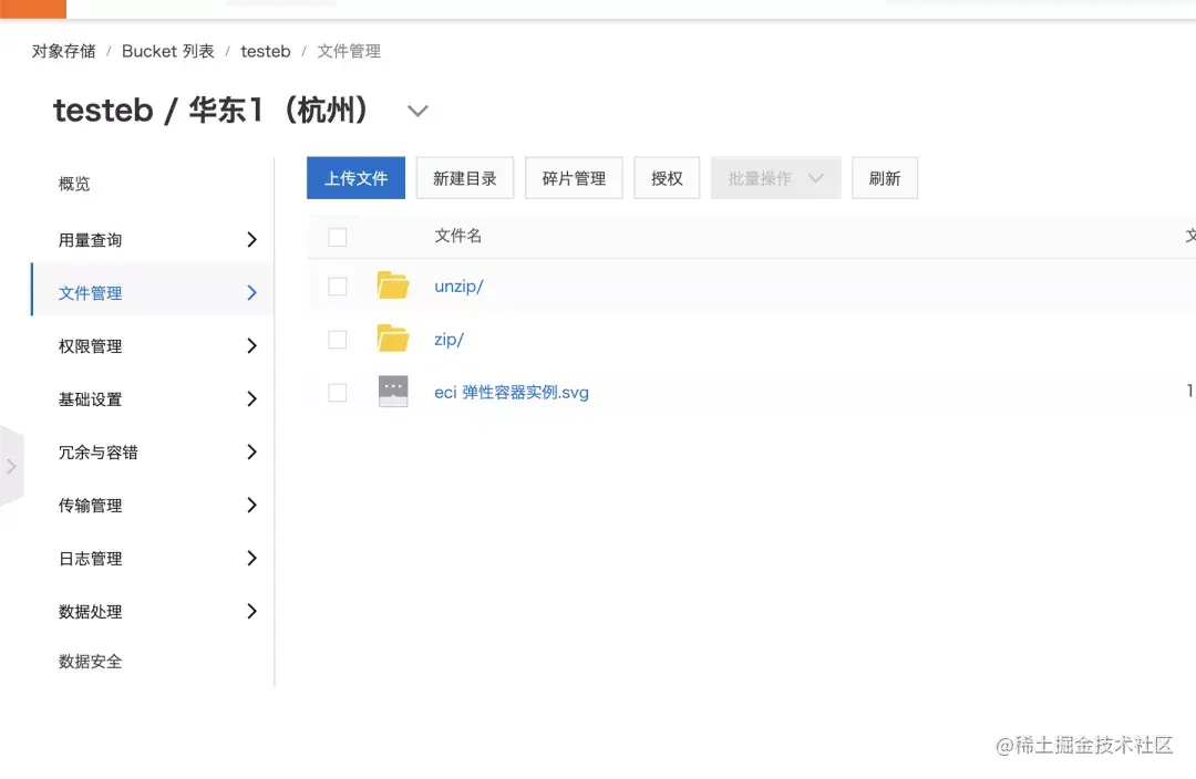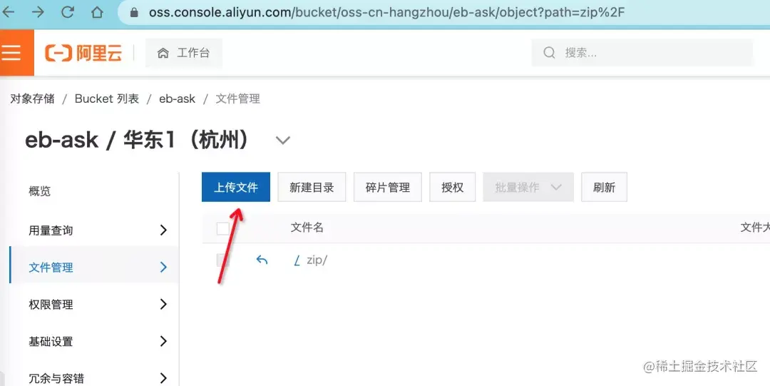 打开 OSS 控制台**[8]** ,选择配置好的 bucket,进入 zip 目录。