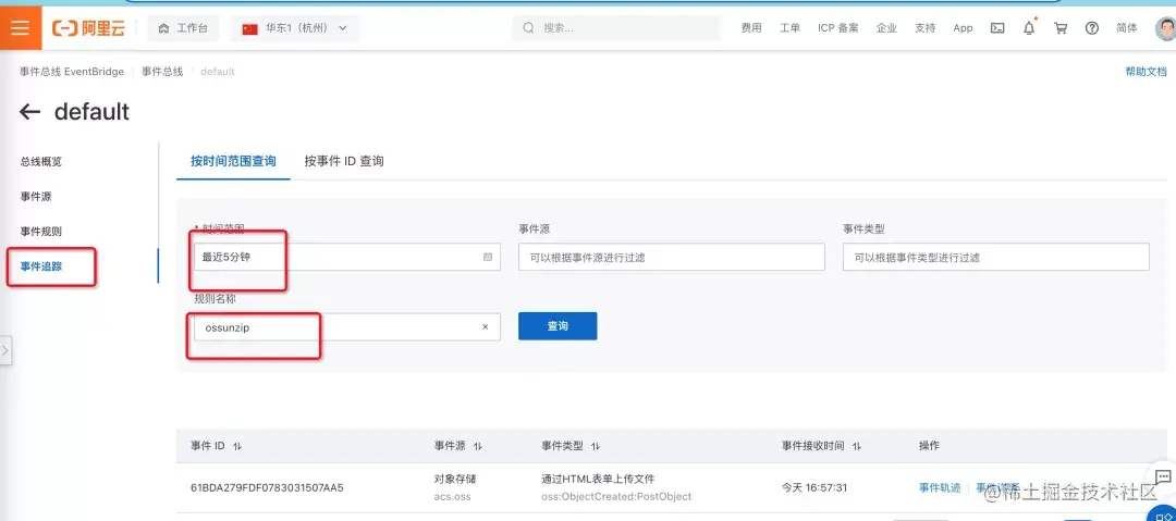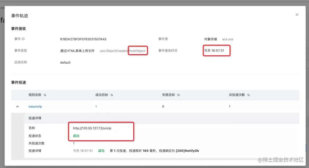 - 点击「事件轨迹」 能看到事件是通过 EventBridge 成功投递到了 ASK 暴露的解压服务上。
