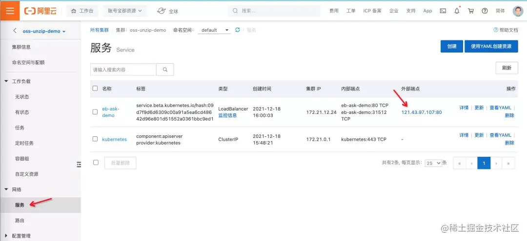 - 服务部署好以后点击「网络」中的「服务」即可看到 eb-ask-demo 这个 Service,然后能看到 「外部端点」的地址。「外部端点」地址就是解压服务的地址,全路径是 http://121.43.97.107/unzip