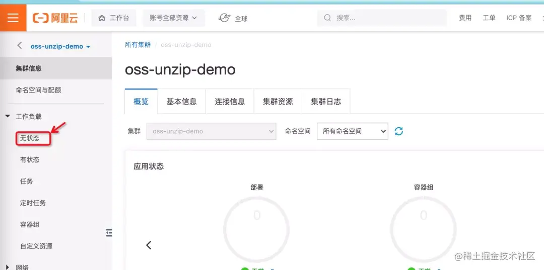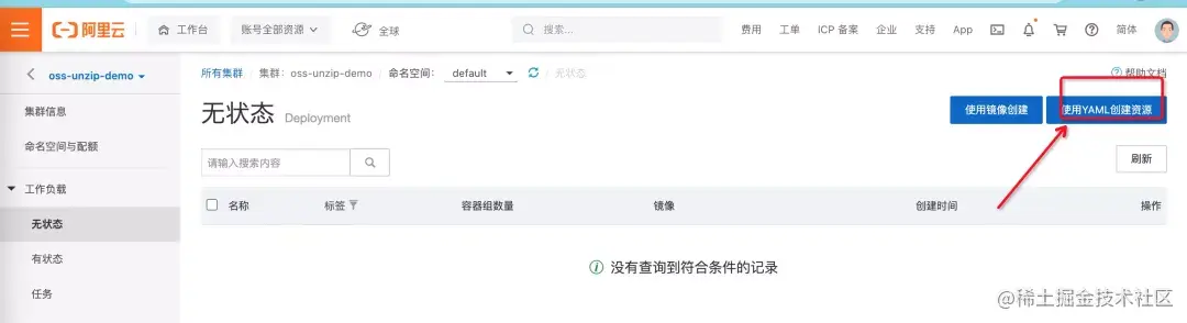 - 在集群详情页面点击 「工作负载」中的「无状态」可以通过提交解压服务 YAML 的方式创建 Deployment 和 Service