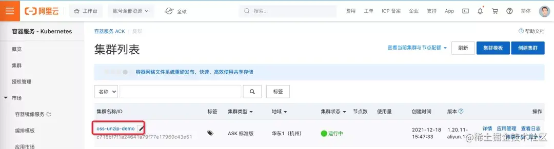 ASK(Serverless Kubernetes) 运行应用程序用于接受来自 EventBridge 发过来的关于 OSS 的事件,所以您首先需要创建一个 ASK 集群,然后部署解压服务。