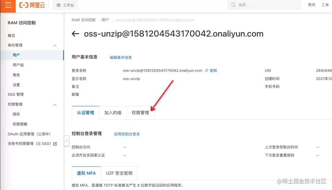 - 有了 ask sk 还不行,要能访问 OSS 服务,还需要给这个子账号授予 OSS 的操作权限,点击「权限管理」。