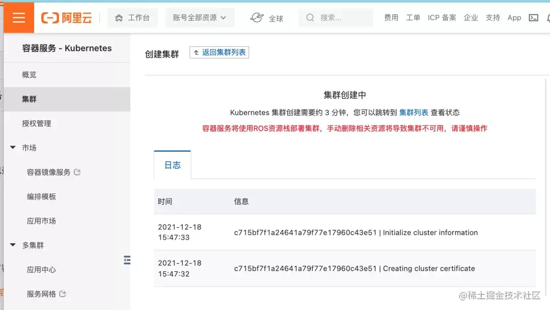 填写集群名称,勾选最下面的《服务协议》,其他都使用默认配置然后就可以创建一个集群出来。