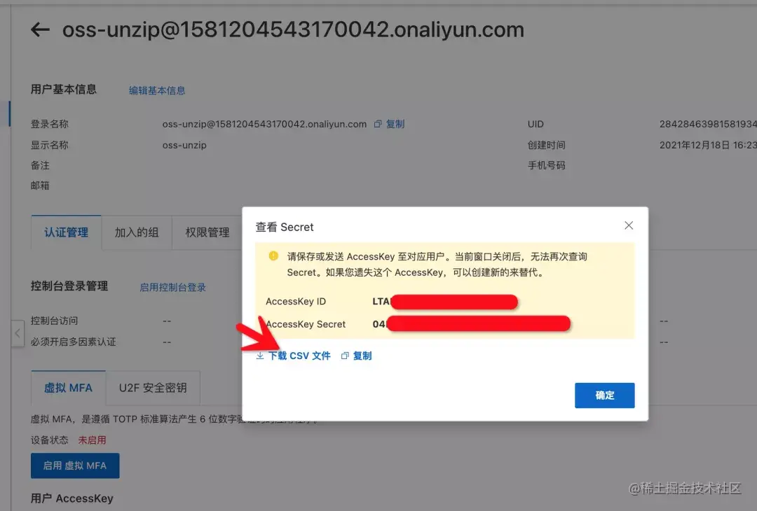 - 然后就能生成 ak、sk 信息,如下所示。保存这两个关键信息,后面配置 ask 解压服务的时候需要使用,也可以点击「下载 CSV 文件」的方式下载下来保存。