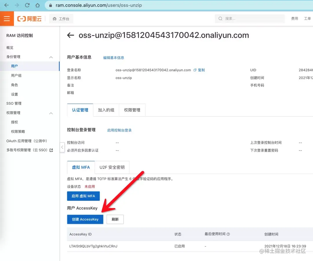 - 点击账号名称,然后来到账号详情页面。点击「创建 AccessKey」。