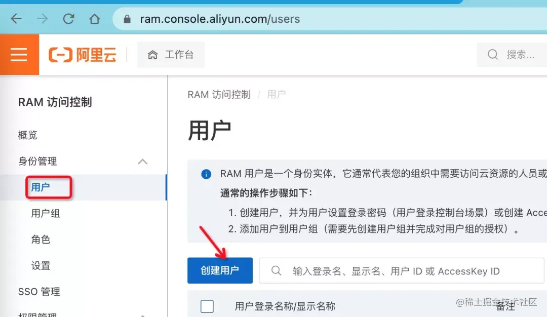 打开 RAM 控制台**[1]**,点击「创建用户」。