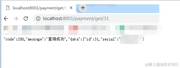 将项目启动之后,进行测试,访问地址:http://localhost:8001/payment/get/1 最后一位为数据库中的主键 id