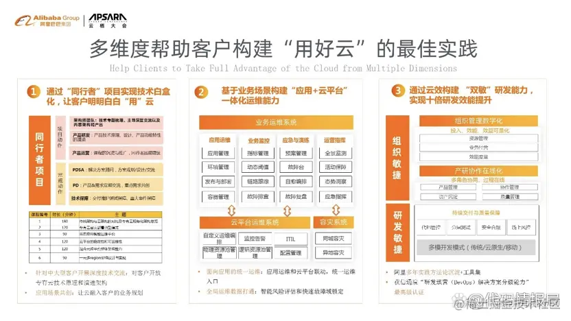“我们把云计算解剖开来,先把自己白盒化,这样可以帮助客户进行更好的理解”,阿里云混合云平台总经理刘国华介绍说。具体说来,阿里云将过去十余年的最佳实践总结起来,帮助客户实现端到端的运维能力提升。阿里云还提供了定向开源,用户可以基于自身业务对于原有应用进行二次开发,并可以实现双敏研发能力,帮助客户更好的使用云原生。即通过技术白盒化、应用+云平台一体化运维、双敏研发效能实现客户明明白白的“用好云”。
