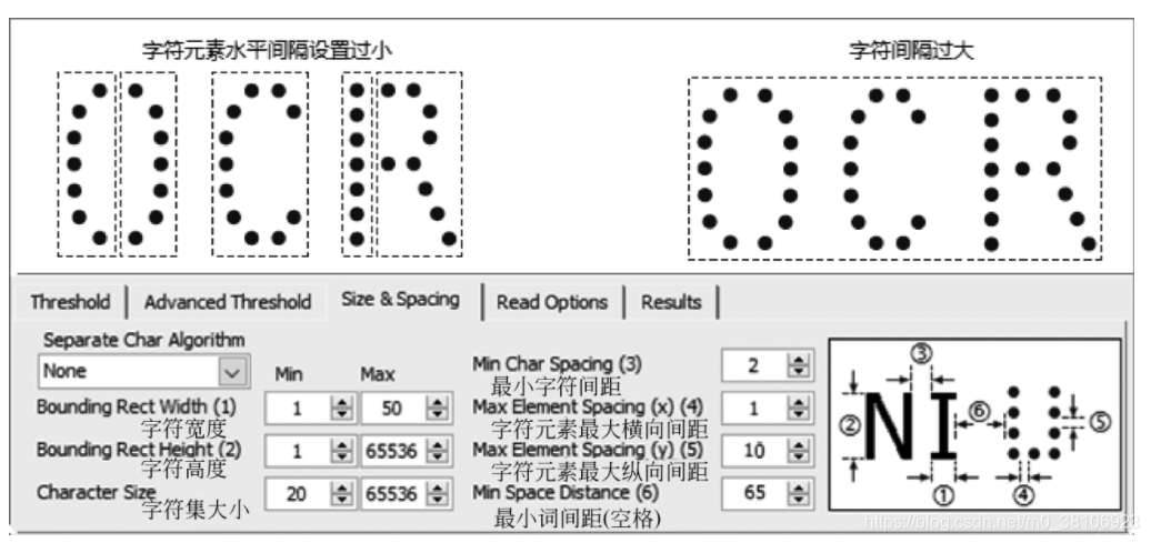 下图显示了NI OCR训练器(位于:National Instruments\Vision\Utility\OCR Training Interface\OCR Training.exe)用来设置字符属性的界面,以及两种OCR无法正确识别字符的示例。由于示例中字符元素横向间隔设置过小,因此点阵字符O和R无法被完整识别。而由于字符间隔设置过大,OCR 3个字符被当成了一个字符。