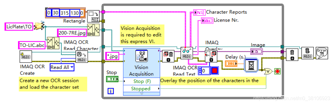 - 在While循环中,程序将图像读入内存后,先删除所有图像中的叠加图层,然后由IMAQ OCR Read Text 3从设定的ROI中识别车牌;