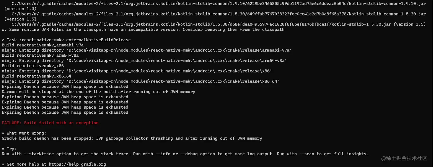 React Native Android 项目使用 ./gradlew assembleRelease 命令打包报错 Gradle build daemon has been stopped: JVM garbage collector thrashing and after running out of JVM memory