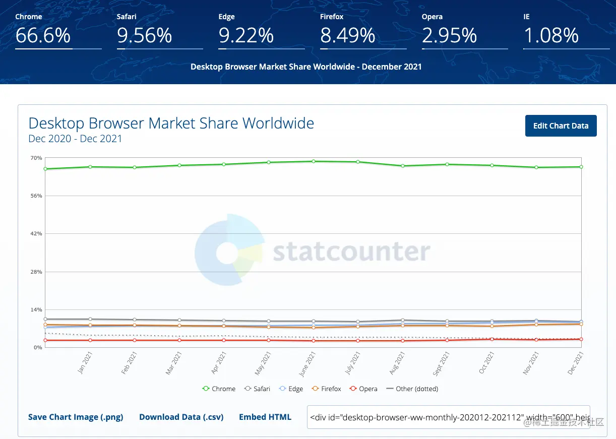 而随着时间的推移,Chrome浏览器在桌面领域一骑绝尘。将原来的对手抛到了脑后。根据statcounter[6]的最新统计,Chrome浏览器已经占据了半壁江山。