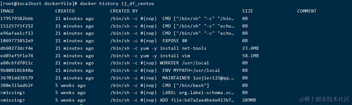 [root@localhost dockerfile]# docker build -f dockerfile-centos -t lj_df_centos .