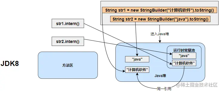 String.intern()方法介绍:如果字符串常量池中已经包含一个等于此String对象的字符串,则返回常量池中这个字符串的String对象;否则,将此String对象包含的字符复制添加到常量池中,并返回此String对象的引用