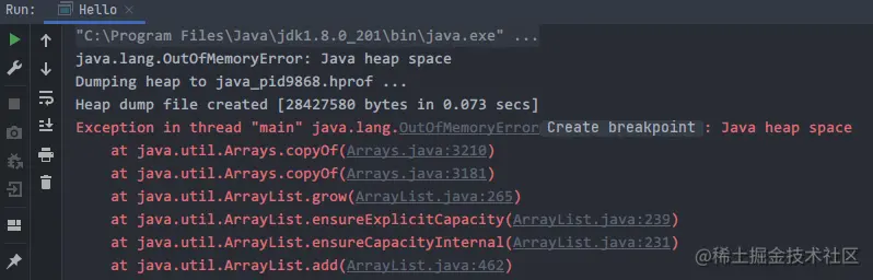 * VM参数:-Xms20M -Xmx20M -XX:+HeapDumpOnOutOfMemoryError