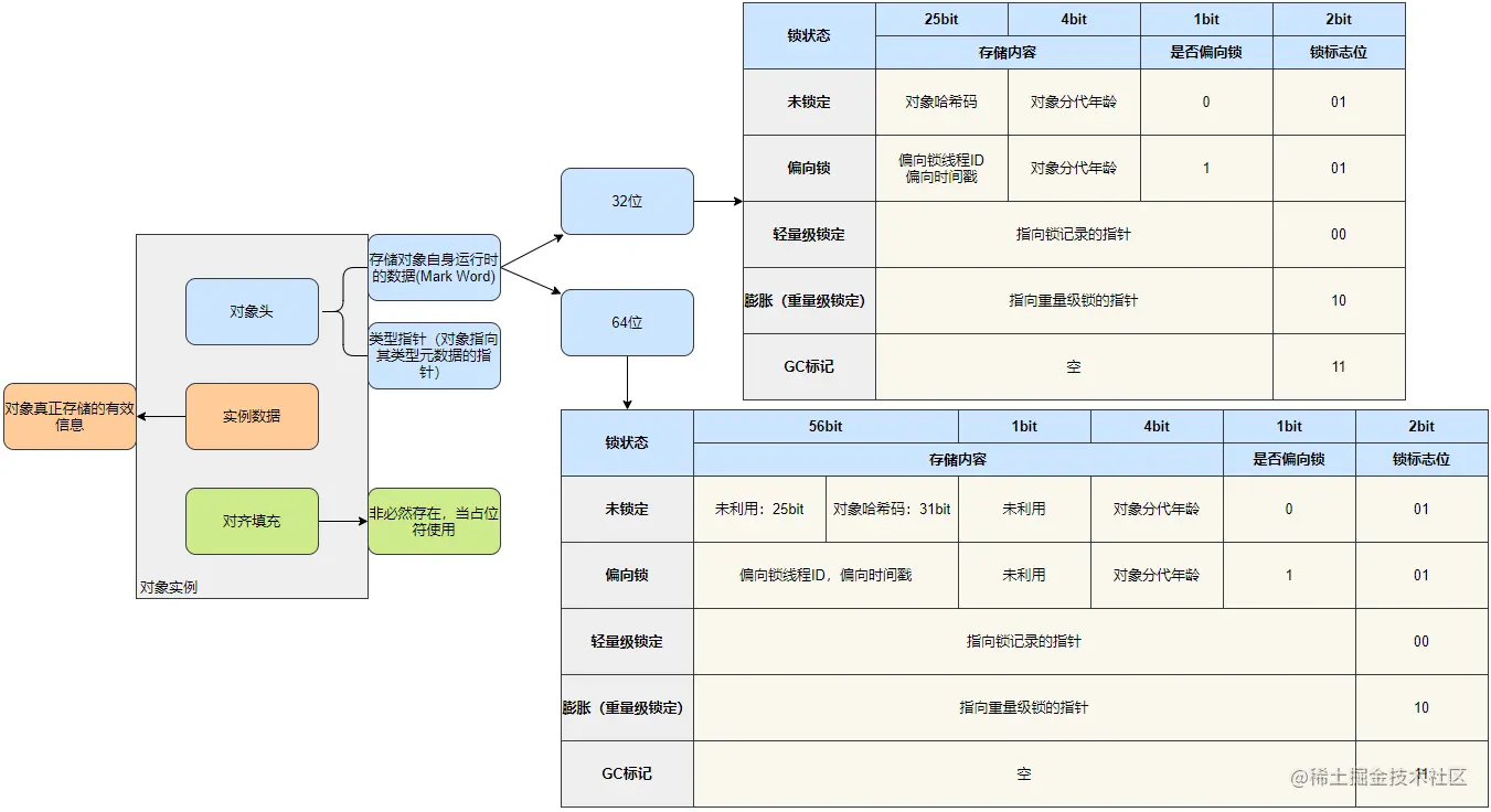 - 存储对象自身运行时数据(Mark Word),如哈希码(HashCode)、GC分代年龄、锁状态标志、线程持有的锁、偏向线程ID、偏向时间戳等