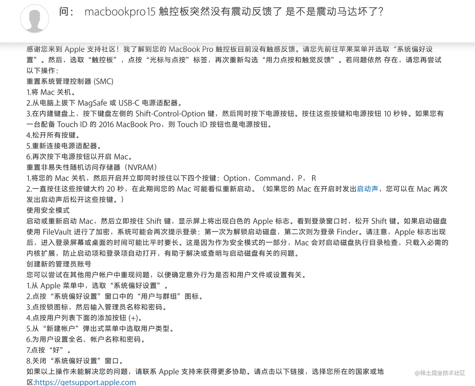 有问题先问一波百度,但是没有办法点击所以拿出了我压箱底用的鼠标,散发着红黄蓝绿光的鼠标将我指引到了apple的讨论区,发现有很多人遇到了和我一样的问题,这个问题的官方标准说法是‘触控板突然没有震动反馈了,是不是震动马达坏了’,嘿嘿,原以为触摸板上的按压操作时物理按键,原来还有个震动马达这个小玩意,长见识了。