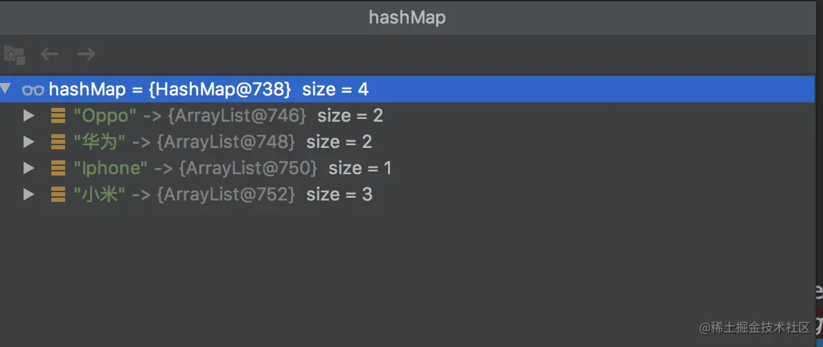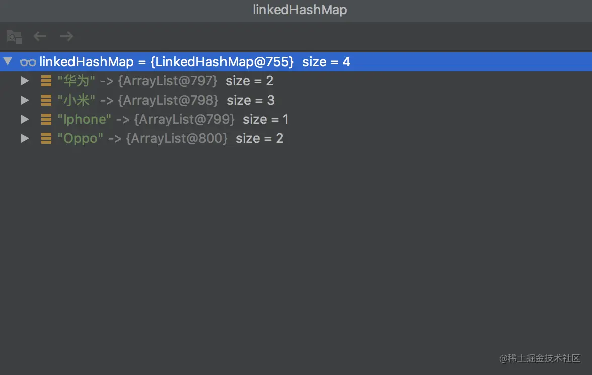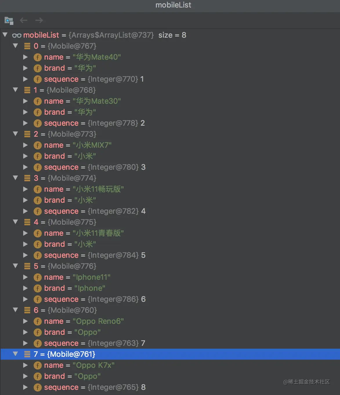 LinkedHashMap<String,List<Mobile>> linkedHashMap = mobileList.stream().collect(Collectors.groupingBy(Mobile::getBrand, LinkedHashMap::new,Collectors.toList())); } public static List<Mobile> getMobileList() { Mobile mobile1 = new Mobile("华为Mate40","华为",1); Mobile mobile2 = new Mobile("华为Mate30","华为",2); Mobile mobile3 = new Mobile("小米MIX7","小米",3); Mobile mobile4 = new Mobile("小米11畅玩版","小米",4); Mobile mobile5 = new Mobile("小米11青春版","小米",5); Mobile mobile6 = new Mobile("Iphone11","Iphone",6); Mobile mobile7 = new Mobile("Oppo Reno6","Oppo",7); Mobile mobile8 = new Mobile("Oppo K7x","Oppo",8); return Arrays.asList(mobile1, mobile2, mobile3, mobile4, mobile5, mobile6, mobile7, mobile8); } }