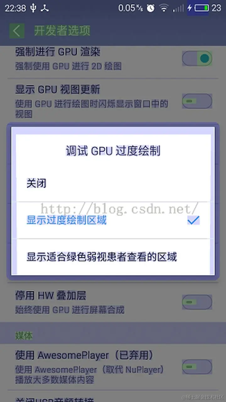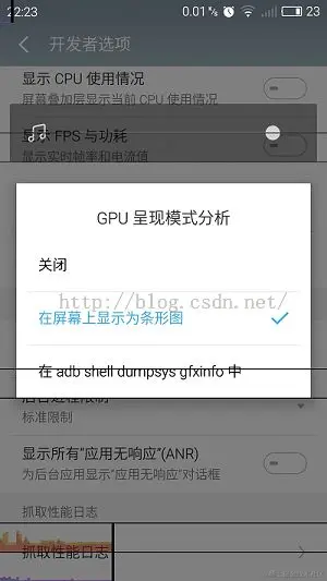 2)可通过在手机上打开 设置->开发者选项->调试GPU过度绘制,然后操作应用查看gpu是否超线进行初步判断;